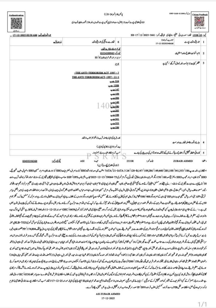 اس کے علاوہ دفعہ 144 کی خلاف ورزی کی دفعہ اور سرکاری املاک کو نقصان پہنچانا بھی شامل ہے، تھانہ صدربیرونی میں درج ایف آئی آر میں ظفر گوندل، شفقت عباس، طارق ساہی ،عثمان جوڑا سمیت 35افراد کو نامزد کو بھی نامزد کیا گیا ہے.