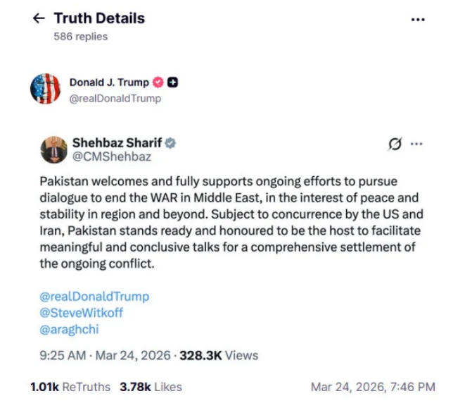 وزیراعظم شہباز شریف کا بیان امریکی صدر ٹرمپ نے ٹروتھ سوشل پر بغیر کسی کیپشن کے شیئر کیا ہے۔