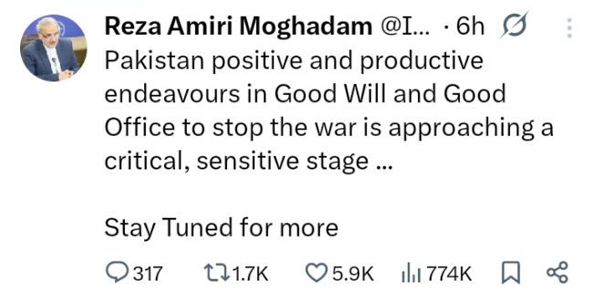 اسلام آباد: پاکستان کی جنگ روکنے کی کوششیں اہم مرحلے میں داخل، تفصیلات کا انتظار کریں، ایران کے پاکستان میں ایرانی سفیر رضا امیری مقدم نے سوشل میڈیا پر جاری بیان میں جنگ بندی کے حوالے سے اُمید کا عندیہ دیا ہے.
