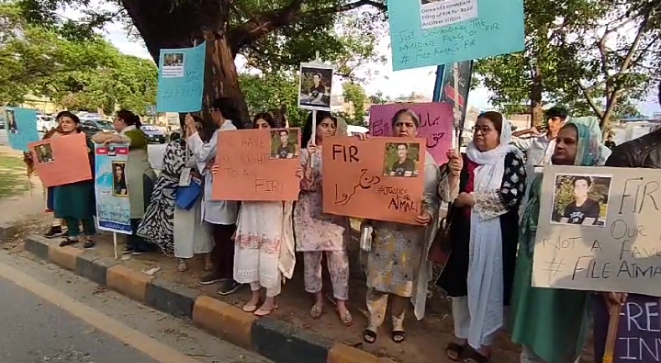 اسلام آباد : نیشنل ڈیفنس یونیورسٹی سٹوڈنٹ کی موت،مقدمہ درج نہ ہونے کیخلاف احتجاج ،19 دن گزرنے کے باوجود بھی مقدمہ درج نہ ہونے پر شہید ایمل سرفراز کے والدین کو بھی سڑک پر آنا پڑا اور کوہسار تھانے کے سامنے احتجاج کیا ۔