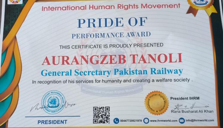 اورنگزیب تنولی سابقہ اسسٹنٹ پرسانل آفیسر راولپنڈی ڈویژن و سیکرٹری جنرل آل پاکستان ریلویز پینشرز ایسوسی ایشن اور محمد یونس جٹ فوکل پرسن آل پاکستان ریلویز پینشرز ایسوسی ایشن کو بزرگ پنشنرز، بیواؤں اور یتیم بچوں و بچیوں کی بےلوث خدمات پر پرائیڈ آف پرمارمنس ایوارڈ سے نوازا گیا اور ان کی مثبت کاوشوں کو خراج تحسین پیش کیا گیا۔