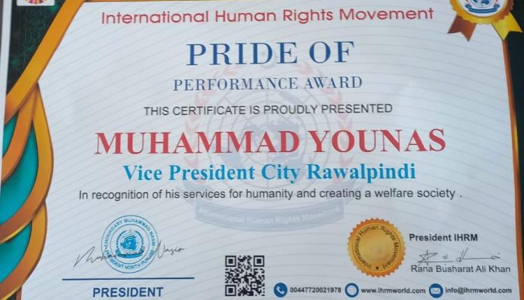 انٹرنیشنل ہیومن رائٹس موومنٹ کی جانب سے ہمیں پرائیڈ آف پرمارمنس ایوارڈ سے نوازا گیا ۔جس پر ہم ان کے نہایت مشکور ہیں۔ انھوں نے کہا کہ ہم پینشنرز کی خدمت عبادت سمجھ کر کرتے ہیں جو تاحیات جاری رہے گی ۔ہماری کوشش رہے گی کہ ہم پہلے سے بڑھ کر اپنے پینشنرز کے مسائل حل کرنے میں اپنا کلیدی کردار ادا کریں۔
